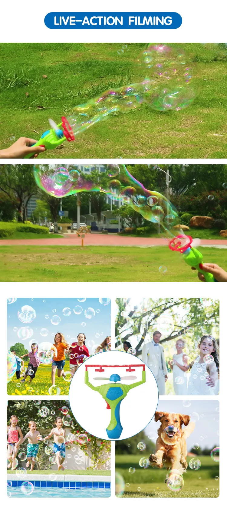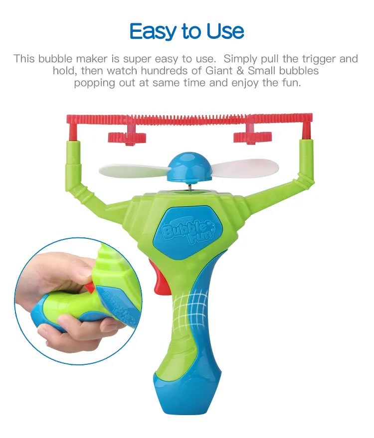 ✔ Easy to Use -- This bubble maker is super easy to use. Simply pull the trigger and hold, then watch hundreds of Giant & Small bubbles popping out at same time and enjoy the fun.