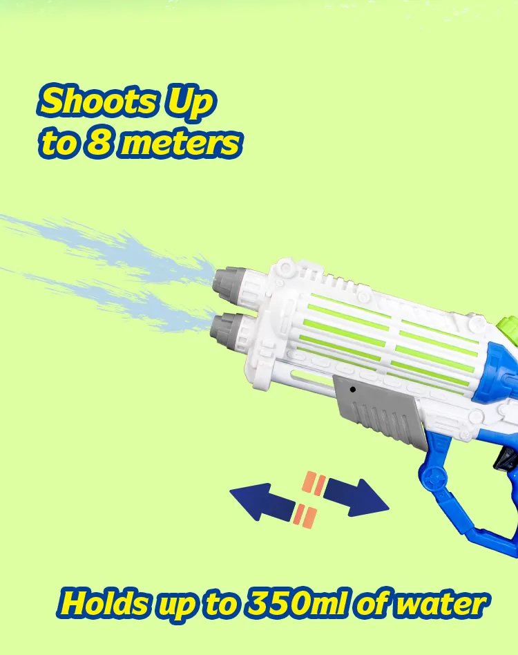 Double Nozzle Squirt Guns with Large Capacity Soaker Up to 26 feet Water Shoot Toys for Boys✔ Stylish Design, Superior Quality, Competitive Price, Prompt Delivery✔ Vivid Colorful Design✔ Easy Operation Water Gun✔ Shoots up to 8 Metres (26.27 Fet)✔ Holds up to 350ml (11.83 oz)of water✔ Double Nozzles Fast Shooting
